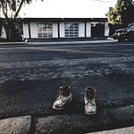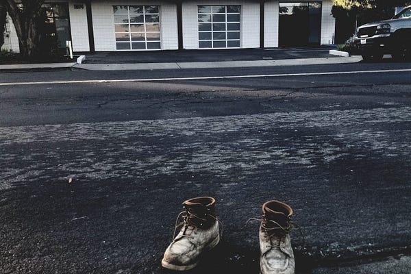 The homeless man, his head bowed down, was chasing after loose change he could find along the roadside.